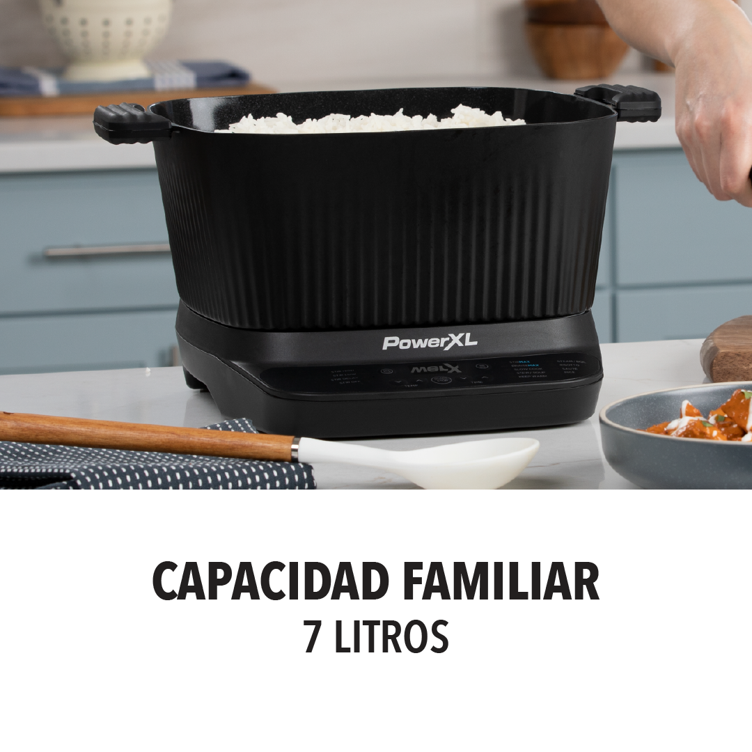 Simplifica tus comidas con la Olla PowerXL™ STIRMAX™, MC107D-1GPLA . Su tecnología Stirmax™ revuelve y deshebra automáticamente, acelerando la cocción un 60%. Con 9 preajustes, puedes cocinar sopas, guisos, risotto y más con solo presionar un botón. La capacidad de 7L es perfecta para toda la familia, y su diseño con tapa de vidrio y asas de silicona facilita su uso. Además, consume un 50% menos de energía. ¡Haz que cocinar sea más fácil y eficiente con la PowerXL™ STIRMAX™! Adquiérela ahora y disfruta de comidas deliciosas sin esfuerzo.
